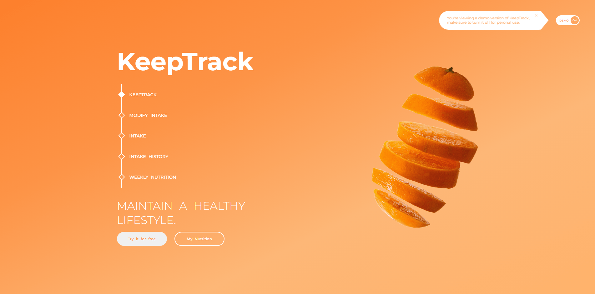 KeepTrack is a personal front-end nutrition tracking project. It's hosted on Netlify and was built using: React, Redux, SCSS, chart.js, and Figma. This project was initially built for personal use only but later I've decided to re-design it, brand it, and put it as one of my projects even if it was built in 2021.