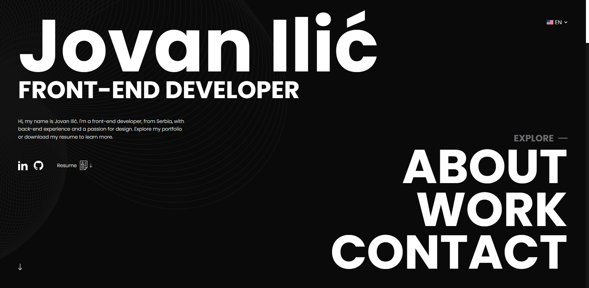 Hi, my name is Jovan Ilić. I'm a front-end developer, from Serbia, with back-end experience and a passion for design. Explore my portfolio or download my resume to learn more.